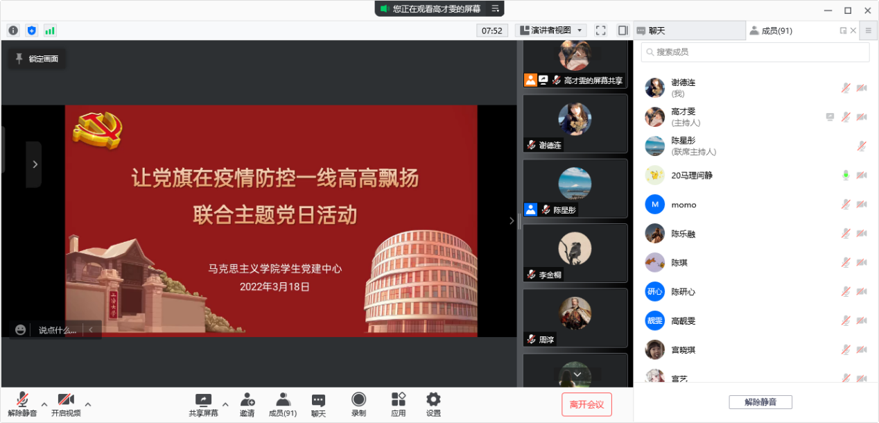 2022年3月18日下午18时,威廉官网中国官方网站学生党建中心组织开展了“让党旗在疫情防控一线高高飘扬” 联合主题党日活动。按照疫情防控要求,学生第一党支部、第二党支部、第三党支部、哲学系学生党支部和博士生党支部全体党员通过腾讯会议线上参加了本次活动。威廉官网中国官方网站学生党建中心主任、研究生辅导员谢德连参与了本次主题党日活动。活动由学生党建中心副主任陈星彤主持。 在学校疫情防控封闭和准封闭管理期间,威廉官网中国官方网站本硕博学生党支部以“服从大局、服务师生、主动担当、发挥作用”为目标,积极开展五个“一”活动,包括一次专题学习、一次专题讨论、一次帮扶慰问、多次志愿服务、为群众办实事,主动服务学校疫情防控工作大局,发挥党支部战斗堡垒作用和党员先锋模范作用。 【思想引领,凝魂聚气】 党建中心副主任陈星彤带领党员们集体学习了习近平总书记近期在中共中央政治局常务委员会上关于疫情防控的重要讲话精神。习近平总书记指出,常态化疫情防控以来,我们坚持“外防输入、内防反弹”,不断提升分区分级差异化精准防控水平,快速有效处置局部地区聚集性疫情,最大限度保护了人民生命安全和身体健康。当前要保持战略定力,坚持稳中求进,在疫情较为严重的地方,“要把防疫工作放在第一位,尽锐出战,决战决胜” “努力用最小的代价实现最大的防控效果”。 【党员先行,志愿有我】 学生第三党支部彭思敏: 我明白,在这样的危急时刻,党员当即挺身而出,义不容辞!从第一轮到第五轮核酸检测,我全程参与志愿服务,从未缺席,累计志愿时长达50余小时,服务3.8万人次。除了自身参与,我还负责80余名青马班同学的志愿服务统筹安排工作,保障各类志愿服务有条不紊地进行,我想尽一份力、发一点光。 学生第二党支部闫静: 在宿舍管控期间,一直想着在宿舍之外能为学校、为大家做点什么,在看到其他党员奋勇争先报名志愿服务,我深受鼓舞,便积极报名,我始终认为身为党员,有一分热便发一分光,力所能及为大家服务;在志愿服务中,我感受最深的是各位同学能够克服不便,如常进行校园生活。最后,我想鼓励大家要科学认识疫情,摆平心态。 学生第二党支部黄诗琪: 我既是参与志愿服务的志愿者,也是被服务的学生,身为走读生,第一时间就返回学校进行了第一次核酸,在被告知要去体育馆入住,一开始我是不知所措的,但幸运的是,学校和学院给予了我帮助,下午我就领取到了床和被子等重要的物资,保障了基本生活。在服务当天,我需要做的是分发物资、清点人数、记录同学们的需求并及时反馈和处理,当我看见同学们的需求得到满足时,我觉得特别有成就感。 【同心战疫,有序生活】 哲学系学生党支部雷筱菁表示在“抗疫不停学”的号召下积极响应学校政策,她认为在疫情防控特殊情势下,同学们线上学习,并未耽误课程的进度,学生可以在线上与老师积极互动,课下也能积极讨论,并表示期待在线下课堂与老师和同学们的再次相遇。 学生第一党支部书记焦娇作为毕业班党员,就毕业班同学学习和工作方面的进展进行交流。她认为作为即将毕业的研三学生,面对就业压力一方面要保持良好的心态,同时也可以多投递简历,总结经验,为毕业后的就业奠定基础。博士生党支部李晓璐就疫情期间的科研进度和学习方法进行分享。首先他认为疫情封控期间是个非常好静下心来提升自己的机会,需要每天给自己定相应的科研任务并落实完成,多尝试即可进入状态。另外也可以借助丰富的网络资源进行学习,如幕课、相关知名网站推送等平台。最后,他还提倡大家进行适当地锻炼,良好的体魄是学习科研的前提。 【求真务实,心系群众】 在抗击疫情期间,威廉官网中国官方网站学生党员们积极利用三级网络联系对接群众开展“一对一”帮扶工作,在疫情防控以及日常生活中开展志愿帮扶。对接党员针对同学们的反馈,开展个性化的帮助,在情感上给予安慰,在行动上给予帮扶,促进了同学间的友谊,增强了群众与党支部之间的凝聚力。 【模范带头,先锋表率】 在学校党委研究生工作部的指导下,威廉官网中国官方网站5名学生党支部书记积极响应号召,加入到研究生党员突击队中。支部书记在泮池两侧的草坪、下沉式广场等场所进行巡查,佩戴党徽和袖章,在校园防控中主动亮身份,做好劝告与提醒工作,配合学校的联防联控,维护好校园秩序,做到哪里有任务哪里就有党员,做好先锋模范作用。除此之外,各学生党支部书记和支委成员在疫情期间主动配合学校、学院帮助分发物资,关心同学状态,时刻把同学们的困难放在心头。 最后,学生党建中心主任谢德连对此次活动进行总结。首先,她对在此次疫情防控期间辛勤付出的所有党员提出表扬。在这次疫情防控期间,每一位党员认真完成学习任务的同时积极配合学校疫情防控工作,拥有大局意识,做到了主动担当。其次,她对党员提出几点建议。她指出,所有党员同志首先要做好学生的本分,提高在校内外的学习效率,与导师积极沟通联系,做好课程论文撰写和职业生涯规划;毕业班同学还要妥善处理好学习与工作的平衡,继续完善学位论文,调整好就业心态;校园准封闭期间,所有同学跨片区流动仍然要严格按照防控要求执行,以保证校园学习生活的正常秩序。最后,她提出
