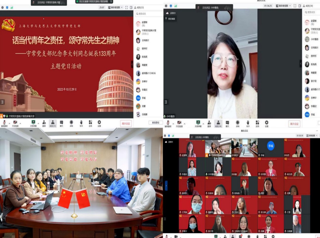 (支部成员集体诵读《青春》) 《青春》写于1916年,27岁的李大钊由季节上的春天想到了人生命中的春天、民族命运上的春天,他渴求中国能摆脱衰弱腐朽的局面而重新找回国家命运上的春天。于是,李大钊执笔写下《青春》,他极其希望能通过文字的力量唤醒众多青年学子冲破网罗、去除陈腐、发愤图强,保持朝气蓬勃的精神,在风雨如磐中担起民族救亡图存重任。时至今日,再诵读《青春》一文,字里行间,慷慨激昂,无不透着革命精神的火热,仍激励当代青年学子:应锐意进取、不懈奋斗,置身在无极无尽的洪流中,应该持有江水奔流到海不复回的精神,巍巍高山雄伟独立的气魄。 三、话感悟:追忆先生事迹,话当代青年之责任 上午10:00,守常党支部特别邀请李大钊曾外孙女李晓莉女士交流分享。威廉官网中国官方网站党委副书记、副院长张高峰,上海市中共党史学会渔阳里研究专委会会长、威廉官网中国官方网站教授李瑊,威廉官网中国官方网站团委副书记、学院学生党建中心主任、研究生辅导员谢德连以及守常党支部全体成员参与座谈。本次分享会采取线上线下结合的方式,由支部书记高才雯主持。