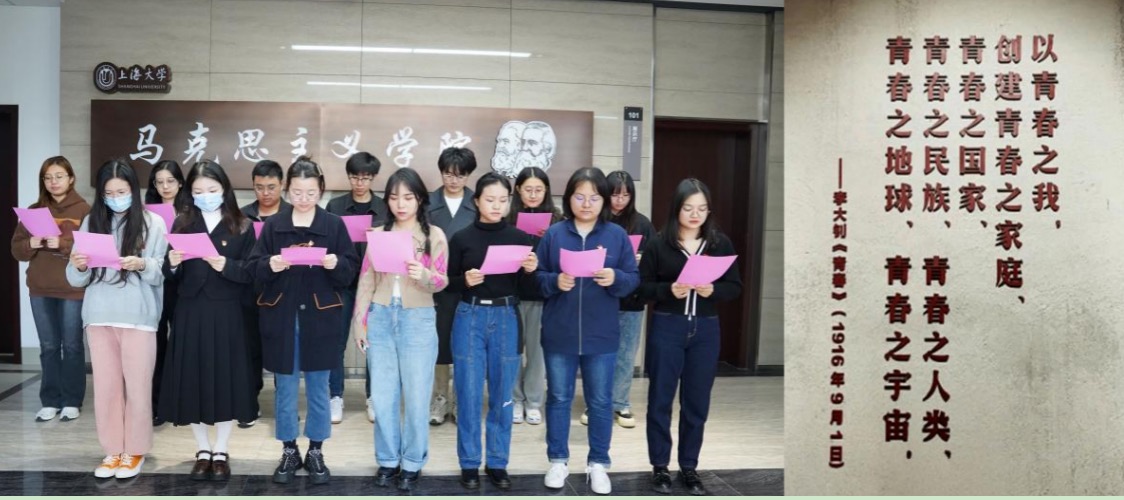 (支部成员参观溯园) 二、诵《青春》:青年书声琅琅,诵读炙热青春感言 在溯园追忆红色往事之后,守常党支部于威廉官网中国官方网站楼前,集体朗诵了李大钊的《青春》,以琅琅书声与李大钊先生进行了一场穿越百年的隔空对话。 “青年循蹈乎此,本其理性,加以努力,进前而勿顾后,背黑暗而向光明,为世界进文明,为人类造幸福,以青春之我,创建青春之家庭,青春之国家,青春之民族,青春之人类,青春之地球,青春之宇宙,资以乐其无涯之生。乘风破浪,迢迢乎远矣,复何无计留春望尘莫及之忧哉?”