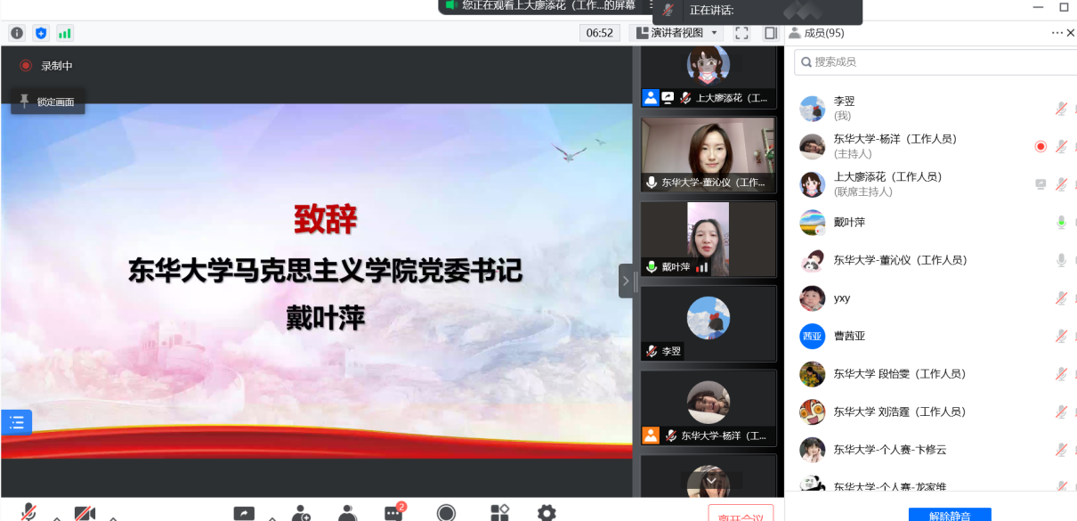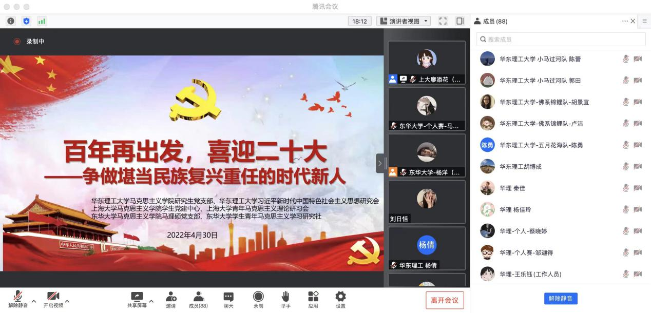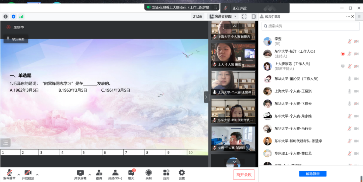 当前正值上海市疫情防控关键时期,为深入学习贯彻习近平总书记在中国人民大学考察时的重要讲话精神,提高在校学生疫情防控管理期间的学习积极性,增强高校威廉官网中国官方网站之间的沟通与联系,以浓厚的马克思主义相关理论学习氛围喜迎党的二十大召开,4月30日上午,由威廉官网中国官方网站、华东理工大学、东华大学三校威廉官网中国官方网站联合举办的“百年再出发,喜迎二十大”党史专题知识竞赛在线上举行。威廉官网中国官方网站党委副书记、副院长张高峰、学生党建中心主任、研究生辅导员谢德连,华东理工大学威廉官网中国官方网站党委副书记杨倩、团委书记胡博成,东华大学威廉官网中国官方网站党委书记戴叶萍、青年教师白虎和任园出席活动,来自威廉官网中国官方网站、华东理工大学、东华大学威廉官网中国官方网站的12名个人赛选手、9支团体赛代表队及三校百余位学子参加。本次活动由东华大学威廉官网中国官方网站董沁仪主持。