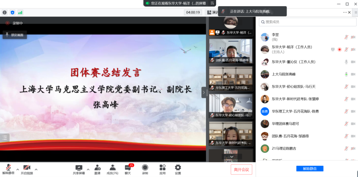 在团体赛环节,各参赛队伍积极抢答、不相上下,现场答题紧张热烈又精彩纷呈,充分展现出参赛选手扎实的学习成果和深厚的理论功底。通过加时赛的激烈角逐,来自东华大学的初心始发队脱颖而出获得第一名,华东理工大学的五月花海队获得第二名,威廉官网中国官方网站的答的都对队、那年杏花微雨队以及东华大学的新时代赶考队获得第三名。白虎和胡博成对团体赛进行了点评。白虎对同学们的昂扬斗志与胸有成竹表示了肯定,鼓励同学们认真学习党史并从中汲取积极进取的力量。胡博成希望三校学生能够继续深入探索,将相关活动与党史学习教育常态化长效化结合起来,打造出品牌效应。 威廉官网中国官方网站党委副书记、副院长张高峰为团体赛做总结发言。他首先对三校竞赛筹备组的工作人员表示衷心的感谢,对获奖的选手们表示热烈的祝贺,并指出此次知识竞赛是在上海市疫情防控关键时期举办,创新了同学们的党史学习形式,提高了在校学生疫情防控管理期间的学习积极性。通过此次竞赛,一方面可以更好地“以赛促学”,给同学们提供一个切磋技艺、展示水平的舞台,在学生中再次掀起勤练技能、学好技能的良好氛围;另一方面可以“以赛促教”,促进学院切实加强技能教学,全面提高教学质量。他介绍到,为深切缅怀李大钊先生,传承革命先辈遗志,威廉官网中国官方网站成立了“守常党支部”,这是对其“少年中国”之期许的坚定回应,“守常党支部”将努力把伟大建党精神转化为自身行动的坚定力量,在不断的学习中继承和弘扬李大钊先生留下的精神财富。最后,他期望三所高校马院以此竞赛为契机,接下来继续加强合作,相关活动可以努力地拓展至上海市,乃至长三角各高校马院,内容上也可以举办如马理论学科主题征文比赛、思政课微课程宣讲比赛等活动,构建马院学子学习、研究、宣传马克思主义和党的创新理论的新平台。