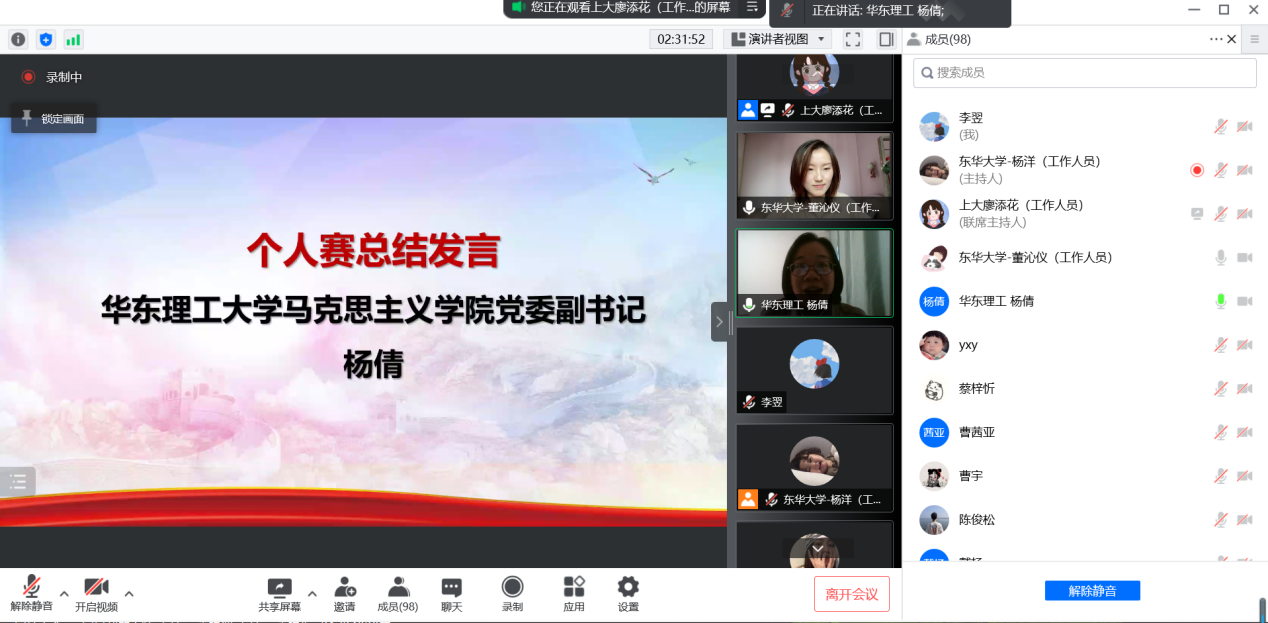 华东理工大学威廉官网中国官方网站党委副书记杨倩为个人赛做总结发言,她指出三所高校威廉官网中国官方网站的同学同台竞技,互相切磋,给了马院学子宝贵的学习交流机会,也有助于增强三个学院的友谊和联系。同时,作为威廉官网中国官方网站的学生,我们应加强学习研究,发挥专业所长,进一步增强自己的理论素养,做到“在马学马、在马言马、在马信马、在马行马”,让自己真正成长为一名堪担中华民族伟大复兴重任的时代新人。