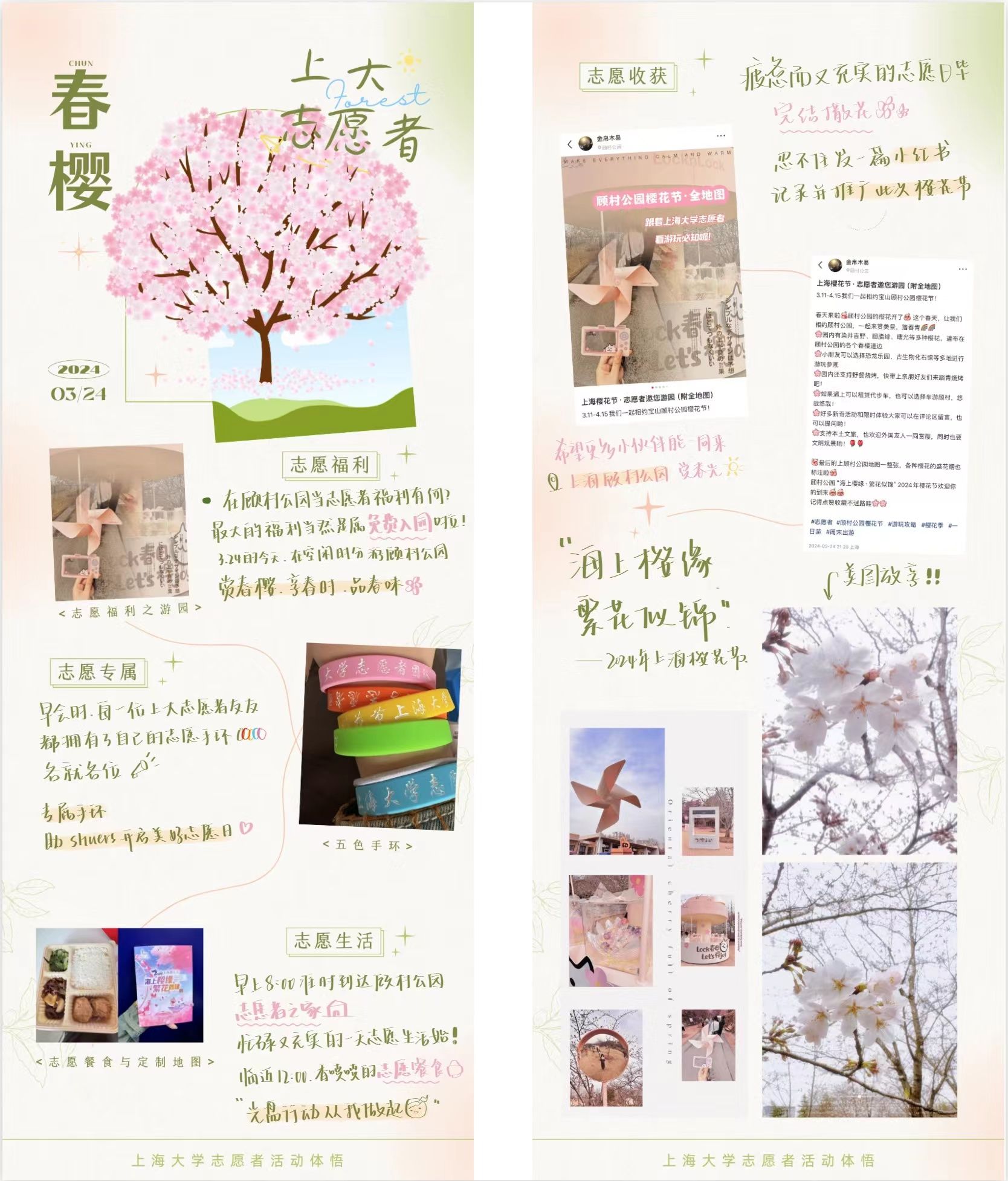 承此志愿心展翅 春光明,花海波光 服务献于春日中,激情若晨霞 笑容绽放希望种,踏歌行绿野 春风拂面时节好,樱花盛开照耀心 2024年上海樱花节威廉官网中国官方网站志愿服务活动在浓浓春意中落下帷幕。自2011年以来,团队十余年如一日地服务在上海樱花节的一线,至今,累计4500余名大学生志愿者在樱花节中尽职尽责,服务时长超50000小时。 今年,我们见证了威廉官网中国官方网站志愿者团队走过的第十二个年头。历经严格的招募、面试、筛选及培训,最终我们组建了一支由480名上大热血青年组成的志愿者队伍,其中包括来自威廉官网中国官方网站的30人核心团队和108名党员志愿者。在学院党委和学校团委的领导下,在学院团委的指导下,这一支队伍不仅展现了上大学子的风采,还传承了上大“自强不息,道济天下”的校训精神和“奉献、友爱、互助、进步”的青年志愿者精神。 青春绽放,志愿风采 在这个春意盎然的季节里,他们以满怀热情、耐心细致的服务赢得了广泛赞誉,彰显了青年的责任与活力。 周末与清明节假期间,志愿者们不畏风雨,持续为上海樱花节的顺利举办提供坚实的支持。无论是热情地为游客指引方向,还是耐心地解答每一位游客的疑问;无论是帮助家长寻找走失的孩童,还是协助游客找回丢失物品,志愿者们始终保持热忱贴心的专业服务。他们的身姿无论是在炽热阳光下,还是在春雨的潮湿气息里,都散发着青春的光彩,他们如同春日里最美的风景,热情服务于顾村公园的每个角落。 志愿者团队的每日大队长们在服务游客的同时,还负责提供志愿团队的后勤保障,如分发午餐、送水和整理志愿者休息处等,确保每位志愿者能以最佳状态投入服务。他们的工作不仅仅局限于现场服务,每日的总结与交流更是他们不断进步的动力。 樱枝盛放,党旗飘扬 3月7日,志愿者团队正式组建。480人的强大队伍中包括108名党员志愿者,占比22.5%,彰显了党员在志愿服务中的先锋模范作用。在校组织人事部组织处的指导下,成立了临时党支部,以党支部为战斗堡垒,确保了志愿服务的高效、有序运行。 临时党支部在整个志愿服务活动中积极发挥核心作用。党员志愿者们以身作则,团结互助,全心全意为游客服务,体现了“党员先行”的精神风貌。他们在活动中不仅展现了优秀的组织能力和服务精神,还充分展现了威廉官网中国官方网站学子的风采。小红帽、红马甲、党徽、樱花徽章成为他们的标志,不仅象征着服务精神,也代表了青年一代的责任与担当。 志愿奉献,特色亮点 志愿者们分工明确,在九大类职责中各展所长,涵盖了问询服务、秩序引导、接待导览等多个领域。他们的服务不仅得到了游客的认可,也得到了宝山团区委与威廉官网中国官方网站团委的关心、支持及肯定。本年度樱花节志愿服务项目纳入了宝山团区委《宝藏青年助力“四个城区”建设志愿服务八大行动》中,指导老师被授予追“锋”队长称号,志愿团队成为首批“青春推介官”助力宝山青年发展型城区建设。此外,宝山团区委在顾村公园中设立了“宝藏青春˙志愿者之家”,这里不仅是志愿者的休憩地,更是志愿精神的传承地。志愿者们分享彼此的故事和经历,相互学习、相互激励。 威廉官网中国官方网站的志愿者们运用短视频、摄影作品、博客文章和手绘漫画等多种形式,捕捉了樱花节的独特瞬间,记录了他们与游客之间的温馨互动、同伴之间的团队协作,通过各种创意媒体作品,生动地记录和分享了他们在志愿服务中的体验和感悟。 (该图来源“顾村公园”微信公众号) 手账作者:威廉官网中国官方网站2023级社区学院本科生曾锦杨 通过这些丰富多彩的创意媒体作品,志愿者们的故事得到了更广泛地传播,加深了社会对于志愿服务的认识和支持,同时也为志愿者自身提供了一个展示才能和分享经验的平台,丰富了他们的志愿服务经历。 好人好事,点亮春天 在这一届樱花节志愿服务中,“好人好事”如同春日里的暖阳,以实际行动点亮了春天…… 悉尼工商学院2021级本科生裘玄宇同学在二号门口值班时,展现了极大的耐心和责任感。遇到一位年迈的老人焦急寻找家人时,他没有犹豫,立刻提供帮助。尽管联系不上老人的家人,他和同学一起陪伴老人,并将其安全带至休息室等待。在他们的共同努力下,老人最终与家人团聚。这一行为不仅是对老人的关怀,也体现了志愿者的责任与温情。 社区学院2023级本科生石雨冰同学同样充满责任心,当一位携带风筝的小女孩迷路时,她毫不犹豫地伸出援手,通过电话帮助小女孩联系家长,并确保她安全等候。在等待期间,她和同伴施石晶通过与小女孩的互动,减轻了其焦虑情绪。他们的及时行动和细心照顾让这个意外小插曲得以温暖而平安地结束。 文学院2023级研究生张艺凡同学得知有游客的孩子走失时,他迅速将信息传达给其他志愿者,并亲自参与寻找。尽管找寻过程中未直接找到孩子,但他的积极参与和对游客的安抚,体现了志愿者在紧急情况下的专业素质和对公共安全的关注。 志愿者心得节选: 理学院2022级本科生张淳熙:今天是顾村公园樱花节志愿者活动的最后一天。在这一个月的樱花节期间,我一共做过三次志愿者活动,从第一天看到只有部分早樱开花,到这次最后一批樱花都已开花,算是有始有终了。我有幸参与到这个热闹而美丽的活动中,为游客