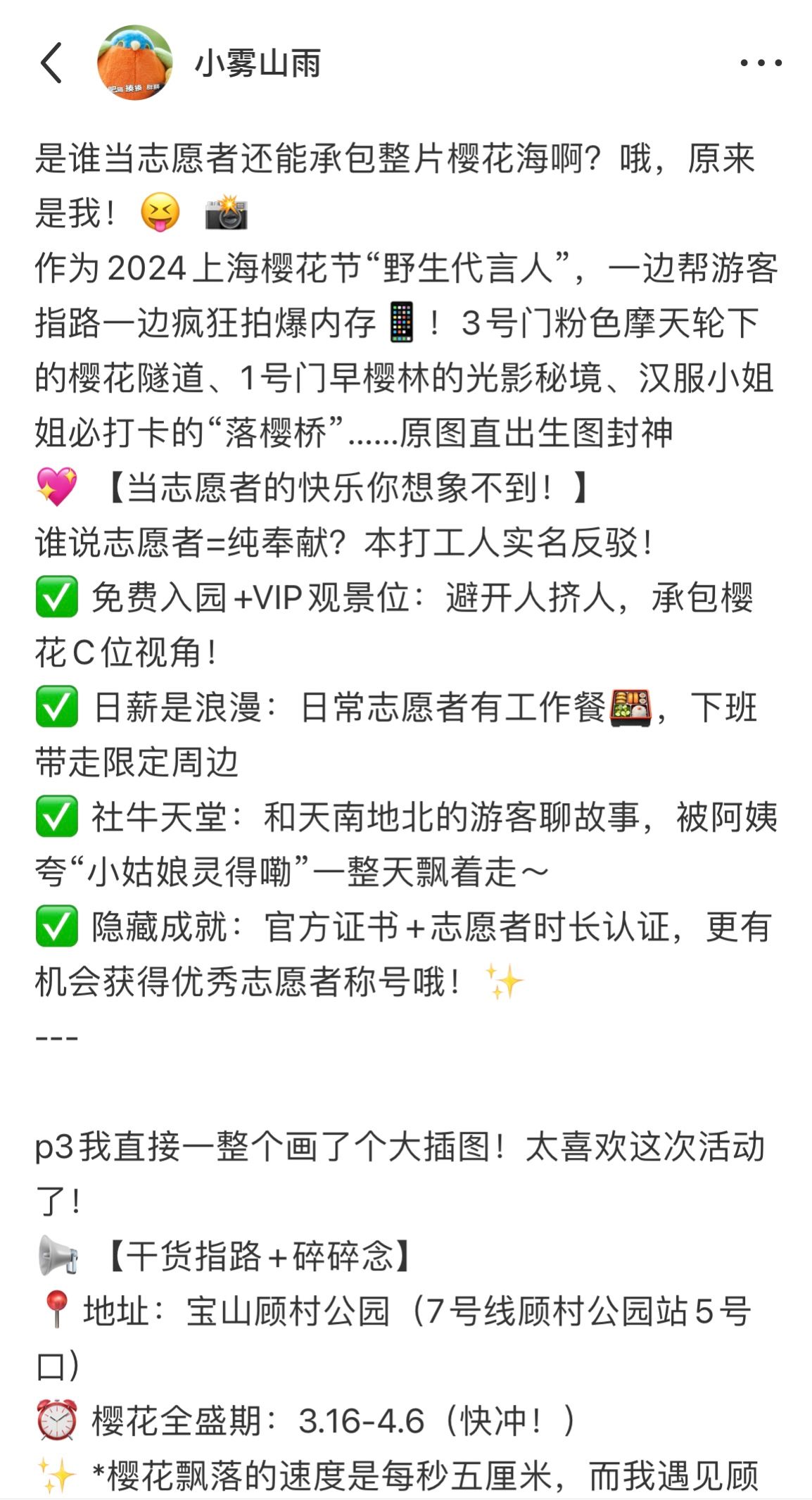 此外,宣传专项组志愿者发挥创意,通过撰写小红书文章、绘制手绘漫画等形式,生动分享个人经历与公园游玩指南,以鲜活有趣的方式吸引了更多年轻人关注并投身志愿服务,激发社会大众责任感。