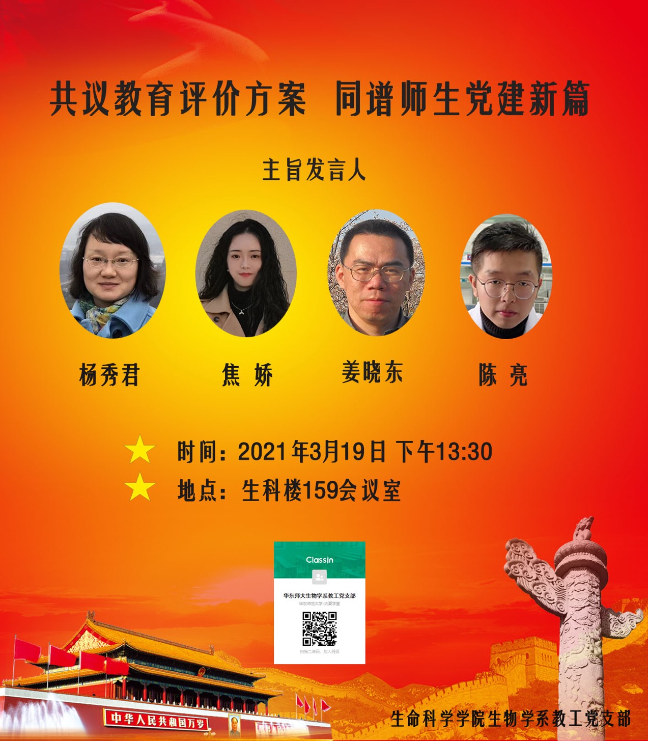 2021年3月19日下午,威廉官网中国官方网站思想政治教育教研部党支部与学生第一党支部赴华东师范大学生命科学学院生物学系教工党支部开展支部共建。该两个教工党支部均为教育部首批全国高校“双带头人”教师党支部书记工作室所在支部。此次支部共建的主题是“共议教育评价方案,同谱师生党建新篇”,线下参加的人员有华东师范大学生命科学学院生物学系教工党支部姜晓东书记、部分教师代表和研究生代表,还有威廉官网中国官方网站思想政治教育教研部党支部书记杨秀君、组织委员刘子杰、宣传委员孙会岩及学生第一党支部的同学们;由于场地所限,支部的其余同志通过ClassIn线上参加。