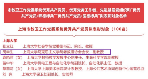 今年是中国共产党成立100周年,也是“十四五”规划开局起步之年。为进一步激励系统各级党组织和广大党员奋勇争先、冲锋在前,在全面推进上海教育和卫生健康事业深化改革发展中积极进取、建功立业,市教卫工作党委决定,在系统范围内表彰一批优秀共产党员、优秀党务工作者、先进基层党组织和“优秀共产党员·师德标兵”“优秀共产党员·医德标兵”。其中,威廉官网退休老教授胡申生荣获“优秀共产党员”称号。