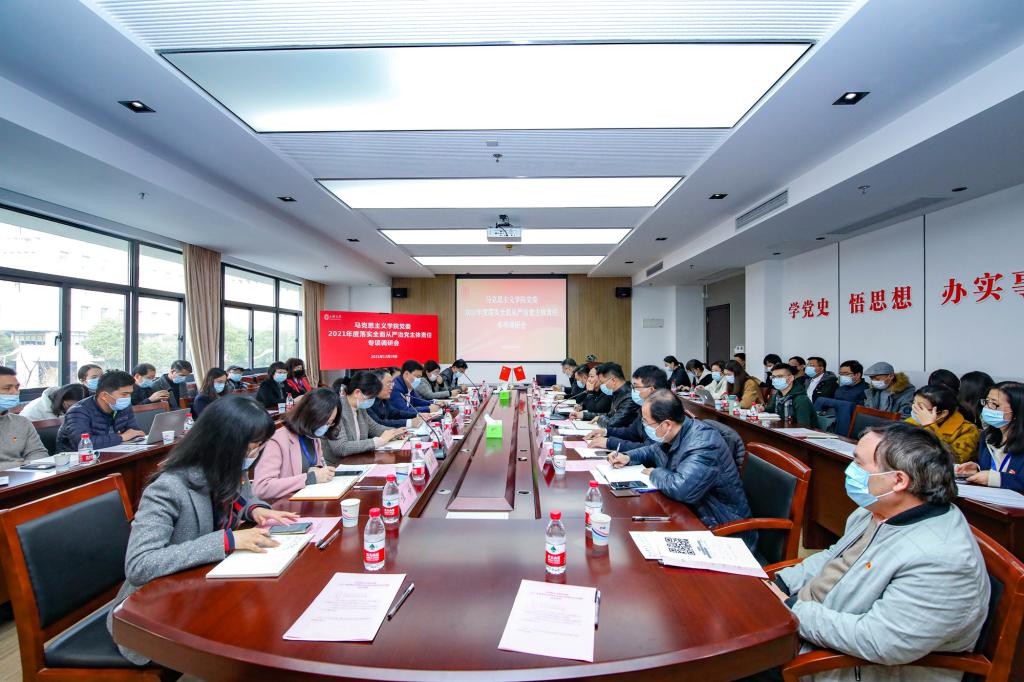 威廉官网中国官方网站党委书记王国建首先做了2021年度学院党委关于落实全面从严治党主体责任情况的工作报告。他从履行管党治党责任情况、意识形态责任落实情况、基层党建工作责任落实情况,以及其他方面责任落实情况等四个方面,汇报了学院党委一年来的相关工作,并对落实全面从严治党主体责任方面存在的问题及原因进行了分析。他表示,学院党委将坚决做好巡察整改工作,从三个方面切实履行好全面从严治党主体责任:一是提高政治站位,增强做好巡察整改工作的政治自觉;二是深刻反思问题根源,巡察整改工作落细落实;三是做到举一反三,建立长效工作机制。 威廉官网中国官方网站院长闫坤如代表学院领导班子从学院基层党建、班子履职能力、三个责任制落实等方面做了威廉官网中国官方网站领导班子2021年度工作述职,并提出了下一年度的工作计划。