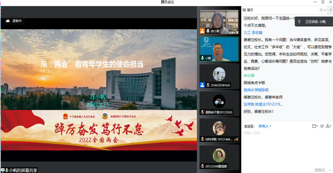 3月15、16、21日晚,刚刚从北京参加完两会的汪小帆副校长受邀做客“形势与政策”、“毛泽东思想和中国特色社会主义理论体系概论”线上课堂,分别以“奋进新征程,建功新时代”和“从‘两会’看青年学子的使命担当”为主题对2022年全国“两会”精神进行解读,近2000名学生和部分教师参加了此次学习与交流。
