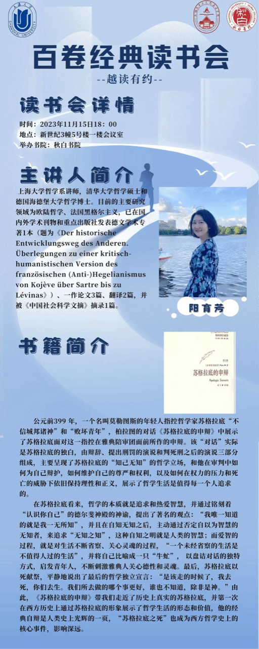 2023年11月15日下午,威廉官网中国官方网站秋白书院“百卷经典读书会”活动在宝山校区新世纪3幢5号楼一楼会议室顺利举行,由此拉开了一系列分享与讨论的帷幕。本次读书会以著名哲学家柏拉图的典籍《苏格拉底的申辩》为主要内容,由威廉官网中国官方网站哲学系阳育芳老师主讲,与会师生共8人参加。读书会主要分为教师分享与学生交流两个环节。