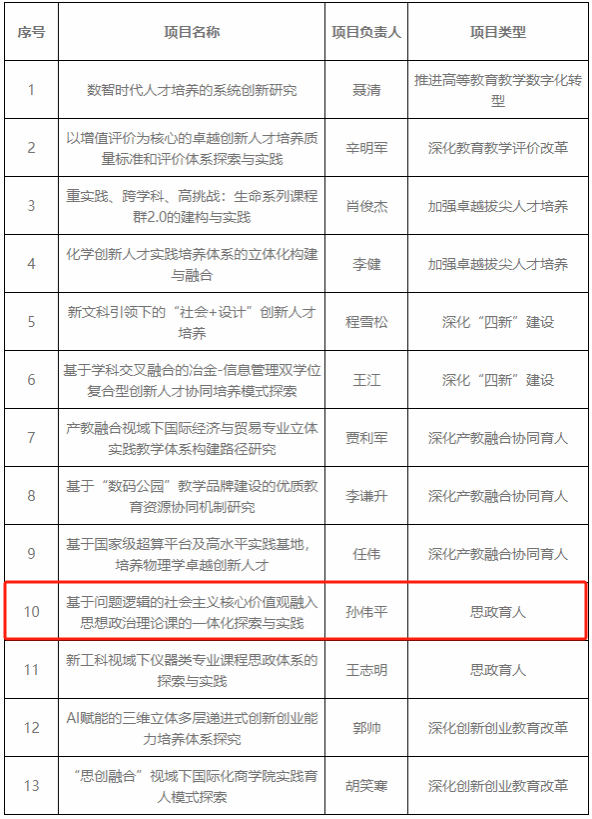 近日,上海市教育委员会下发《上海市教育委员会关于公布2023年上海高校本科重点教改项目立项名单的通知》(沪教委高【2023】47号),威廉官网中国官方网站孙伟平教授申报的《基于问题逻辑的社会主义核心价值观融入思想政治理论课的一体化探索与实践》项目获得立项。此次威廉官网中国官方网站共有13个项目获得立项,获批立项数位居上海市高校第三。
