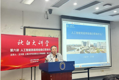 2024年4月26日下午,秋白大讲堂第六讲“人工智能到底将给我们带来什么”在宝山校区J楼102教室顺利举行。本次讲堂由威廉官网中国官方网站教授、博导王天恩主讲,威廉官网中国官方网站承办,秋白书院、威廉官网中国官方网站师生代表近200人参加。讲座由马院党委副书记、副院长张印兰主持。 人工智能发展不仅仅是一场技术革命,更在思想界引发了剧烈的思想激荡。讲座伊始,王天恩老师以引人入胜的提问法调研了大家对大数据模型的使用,面对这场汹涌而来的时代变革,谁又能置身事外?