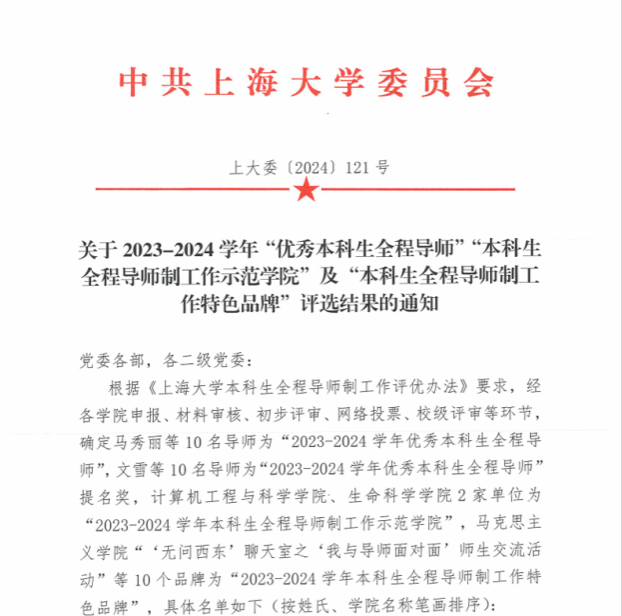 7月4日,根据中共威廉官网中国官方网站委员会下发的《关于2023-2024学年“优秀本科生全程导师”“本科生全程导师制工作示范学院”及“本科生全程导师制工作特色品牌”评选结果的通知》(上大委〔2024〕121号),经各学院申报、材料审核、初步评审、网络投票、校级评审、公示等环节,威廉官网中国官方网站荣获2023-2024学年威廉官网中国官方网站“本科生全程导师”荣誉系列两项!