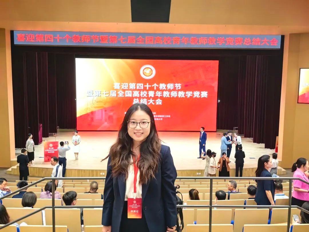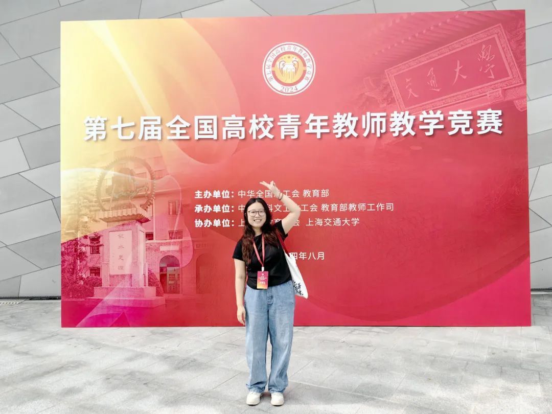 赛前,张青子衿在全国高校青年教师教学竞赛现场 赛后,张青子衿表示,参加全国高校青年教师教学竞赛不仅是一次难忘的经历,更是一场自我成长的革命和洗礼。她说:“当得知自己首次代表学校参与国赛的比拼时,内心既兴奋又紧张。兴奋的是,这是一个展示自己教学能力和风采的绝佳平台;紧张的是,自己作为代表学校出战国赛的第一位选手,与来自全国各地的优秀教师同台比拼,其中竞争的激烈程度与压力都非常大。”