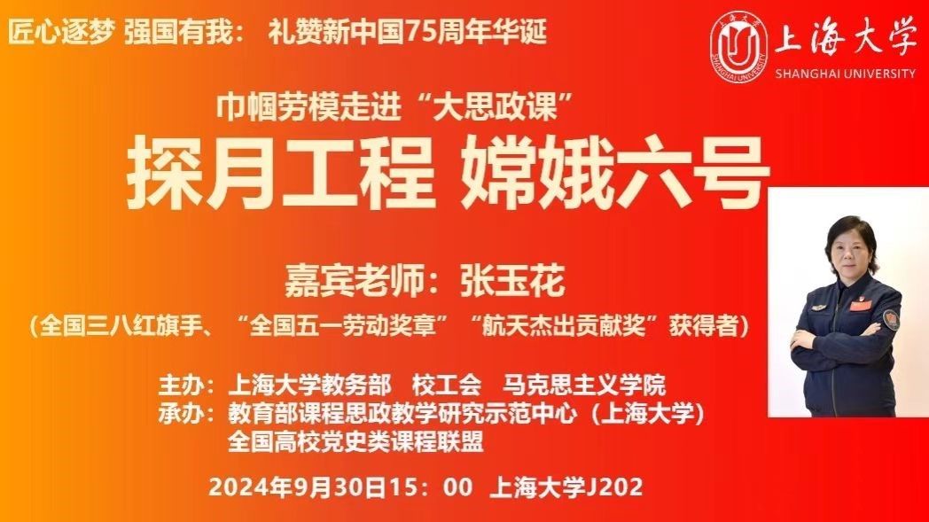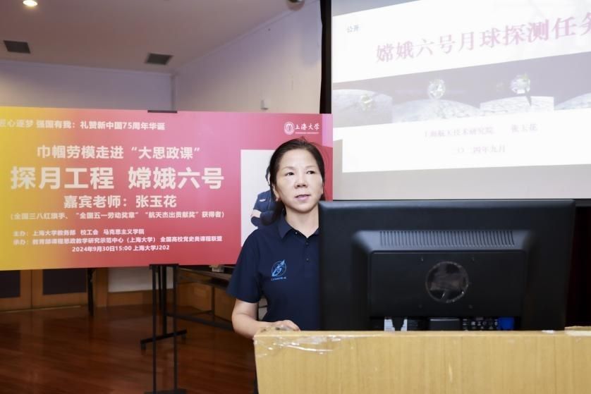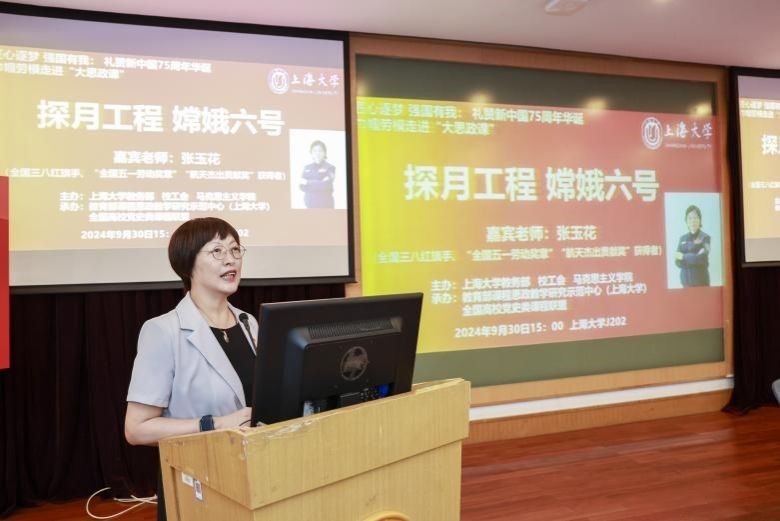 为深入学习贯彻党的二十届三中全会精神,喜迎新中国成立75周年,弘扬探月精神,9月30日下午,威廉官网中国官方网站“巾帼劳模走进大思政课”活动在宝山校区J202举行。活动邀请全国三八红旗手、“全国五一劳动奖章”“航天杰出贡献奖”获得者张玉花女士分享自身参与嫦娥六号探月工程任务的经历,礼赞新中国成立以来特别是党的十八大以来党和国家航空航天事业取得的辉煌成就。 公开课由威廉官网中国官方网站教务部、工会、威廉官网中国官方网站联合主办,教育部课程思政教学研究示范中心(威廉官网中国官方网站)、全国高校党史类课程联盟承办。校党委常委、副校长聂清,校工会常务副主席顾莹、副主席勾金华,校妇委常务副主任吴国琴,威廉官网中国官方网站党委书记王国建、副院长焦成焕,各学院有关负责人,“形势与政策”课程团队骨干教师,教务考评党支部、现教中心党支部党员教师,2个“形势与政策”课程班学生,法学院中夏党支部、法正党支部党员学生,校团委社团骨干学生等共同参与活动。现场红旗飘飘,气氛热烈。 威廉官网中国官方网站教务部副部长、教育部课程思政教学研究中心(威廉官网中国官方网站)负责人、顾晓英工作室主持人顾晓英教授主持公开课。