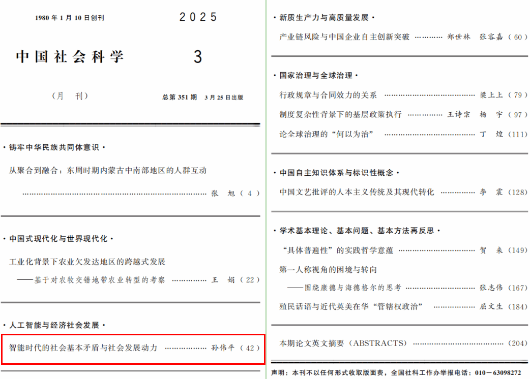 近日,威廉官网中国官方网站孙伟平教授在《中国社会科学》(2025年第3期)发表理论文章,题目为《智能时代的社会基本矛盾与社会发展动力》。 文章指出:“人工智能作为一种革命性、颠覆性的高新技术,正在快速发展并广泛应用于经济、社会各个领域,掀起了一场空前的产业革命和社会变革,彻底改造、重塑了整个社会的基本面貌和形态。智能生产力的快速创新发展,驱动新型技术社会形态——智能社会——加速成型,但建基于工业社会的资本主义生产关系日益落后于智能生产力的发展水平,并进一步导致上层建筑体系越来越不适应经济基础的发展状况,反过来又严重地阻碍了智能生产力和智能社会的发展。解决智能时代的社会基本矛盾,需要在大力发展智能生产力的基础上,建立新型生产关系使之适应智能生产力的发展水平,变革上层建筑使之适应经济基础的发展状况,从而将智能社会的社会基本矛盾转化为强大的社会发展动力,推动智能社会的发展走上‘快车道’,为新型的经济社会形态——共产主义社会——的到来奠定基础、创造条件。” 作者简介:孙伟平,威廉官网中国官方网站伟长学者特聘教授;中国社会科学院大学博士生导师;上海市领军人才。兼任中国现代文化学会副会长及文化建设与评价专业委员会会长,中国辩证唯物主义研究会副会长及价值哲学专业委员会会长。曾任中国社会科学院哲学研究所副所长,直属机关党委副书记(正局级),《世界哲学》主编。主要从事价值哲学、智能哲学研究,主持国家社会科学基金重大项目2项、重点项目和一般项目4项,其他项目30多项。出版专著15部,主编、合著50多部;在《中国社会科学》《哲学研究》《马克思主义研究》《求是》《人民日报》《光明日报》发表论文近40篇,其他报刊300多篇,100多篇次被《新华文摘》《中国社会科学文摘》等转载。著作和论文20多次获得国家和省部级奖励。教育部"长江学者奖励计划"特聘教授;“百千万人才工程”国家级人选;获国家“有突出贡献中青年专家”称号,享受国务院特殊津贴专家。 |