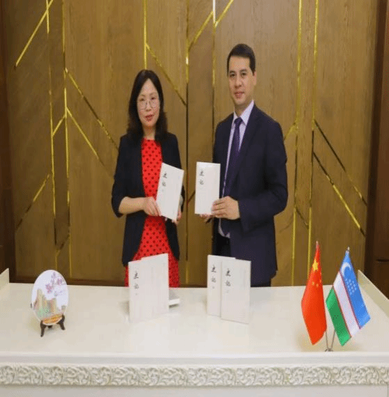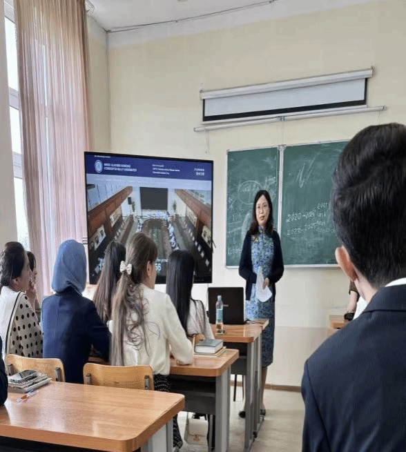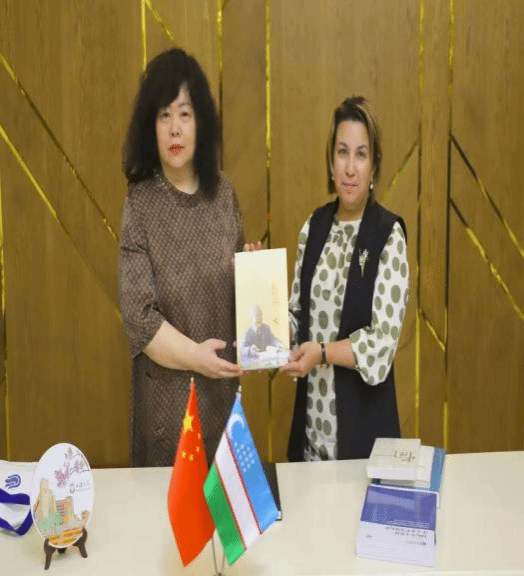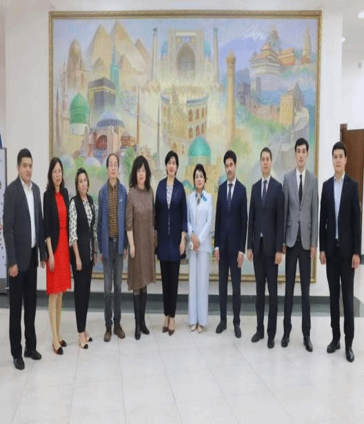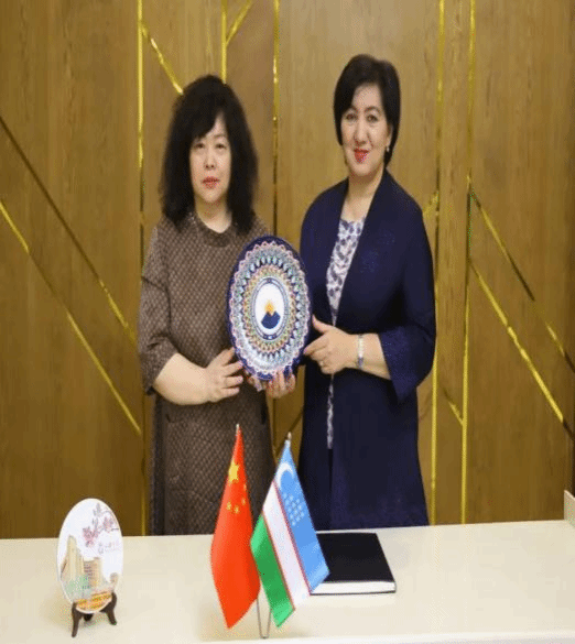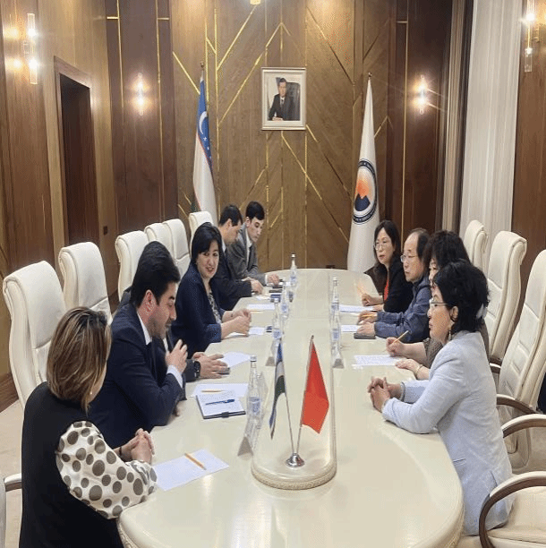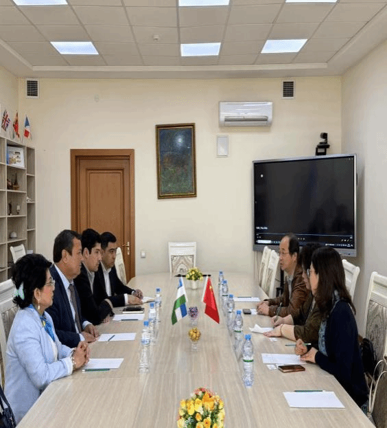 4月17日,代表团在萨伊达·阿戈扎姆霍德热耶娃(Saida Agzamkhodjaeva)教授的陪同下来到塔什干国立东方学大学。大学校长古尔其拉·里克希耶娃(Gulchekhra Rikhsieva),国际交流办公室、中文系、国际关系系和历史系负责人热情接待了代表团一行。