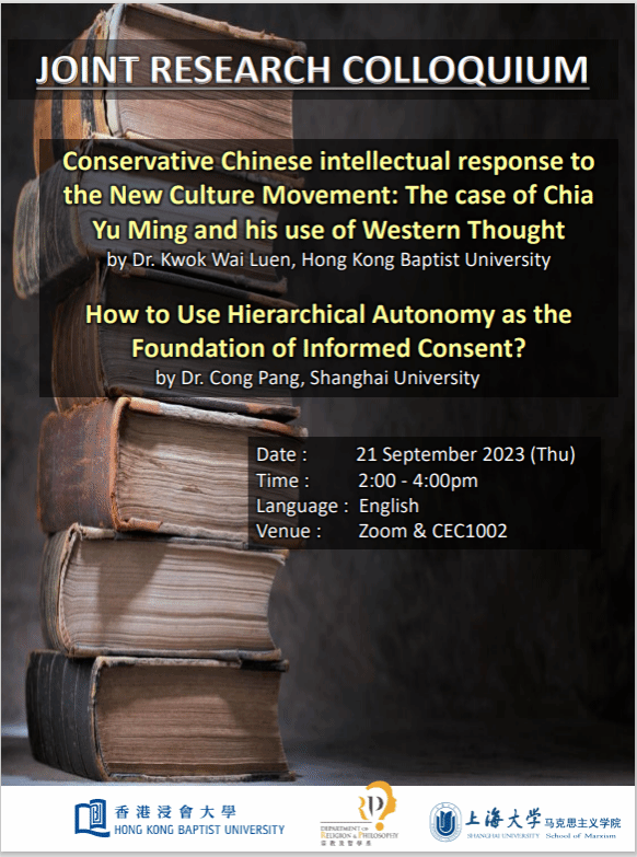 时间 9月21日 下午2:00-4:00 地点 威廉官网中国官方网站宝山校区东区2号楼208室 语言 英语 报告一 对新文化运动的保守理智反应:以贾玉铭对西方思想的运用为例 报告人 郭伟联博士,香港浸会大学宗教与哲学系 报告二 以等级式自主作为知情同意的基础何以可能? 报告人 庞聪博士,威廉官网中国官方网站哲学系 |