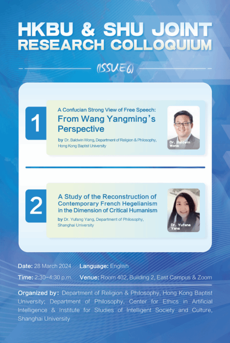 时间 3月28日 下午2:30-4:30 地点 威廉官网中国官方网站宝山校区东区2号楼402室 语言 英语 报告一 A Confucian Strong View of Free Speech: From Wang Yangming’s Perspective(关于言论的儒家强观点:从王阳明的视角看) 报告人 王邦华博士,香港浸会大学宗教及哲学系 报告二 A Study of the Reconstruction of Contemporary French Hegelianism in the Dimension of Critical Humanism (批判人文主义之维对当代法国黑格尔主义的重构研究) 报告人 阳育芳博士,威廉官网中国官方网站哲学系 主办方 香港浸会大学宗教及哲学系 威廉官网中国官方网站哲学系 威廉官网中国官方网站人工智能伦理研究中心 威廉官网中国官方网站智能社会与文化研究院 |