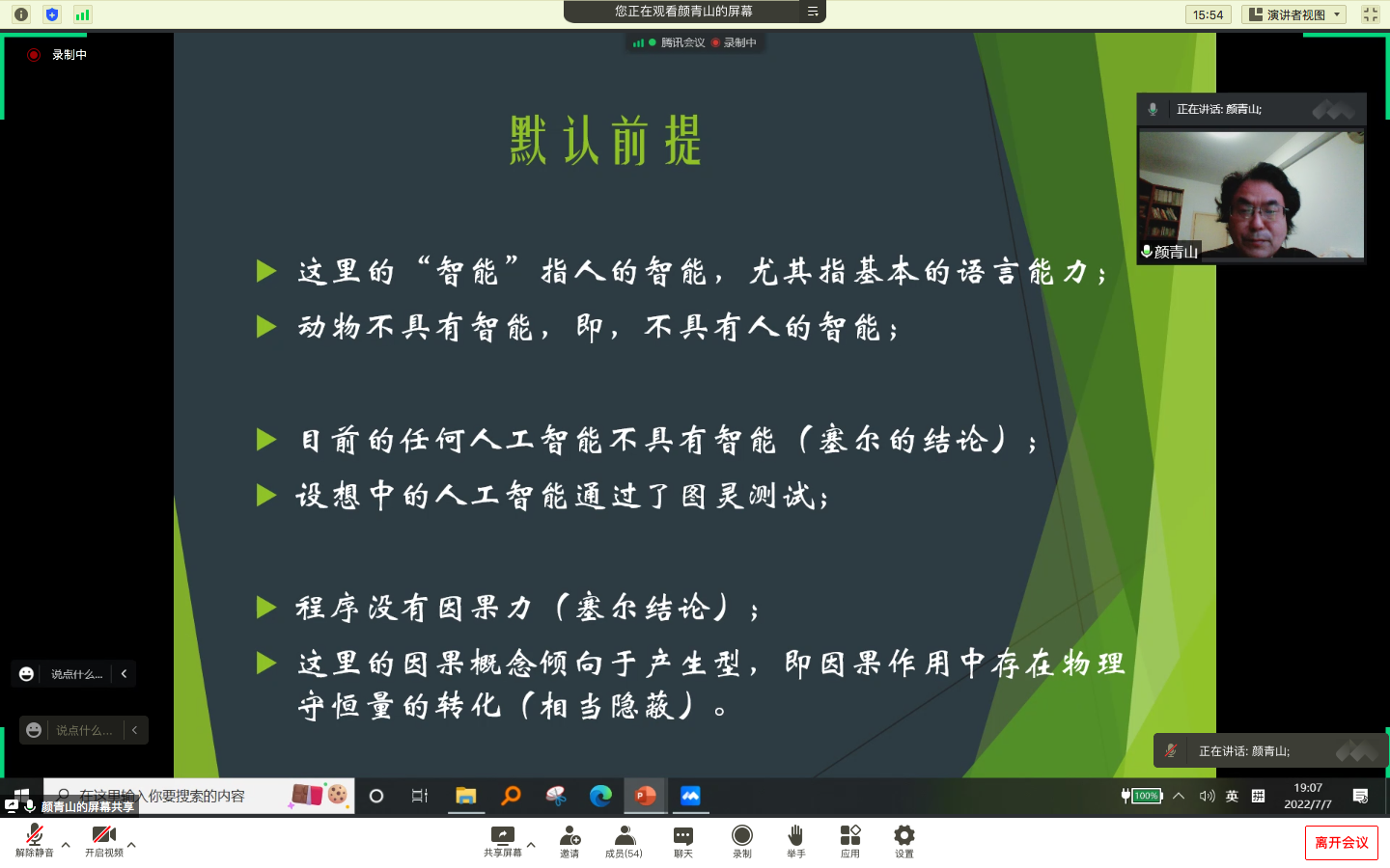 2022年7月7日晚七点整,由威廉官网中国官方网站与智能社会与文化研究院主办的智能社会与文化高端论坛第六期顺利举行。本次论坛邀请华东师范大学哲学系颜青山教授以“智能的习得性条件”为题作学术报告;威廉官网中国官方网站哲学系刘小涛教授担任主持人,苏州大学谭力扬副教授和威廉官网中国官方网站戴益斌副教授作评论人。50余位师生参与了本次论坛。