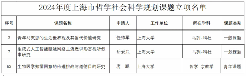 近日,上海市哲学社会科学规划办公室公示了2024年度上海市哲学社会科学规划课题立项名单,威廉官网任帅军、岳爱武、庞聪三位老师拟获批立项。这是威廉官网今年在国家社科项目立项取得最佳成绩的同时,在省部级科研项目方面取得的新成绩。 学院将继续围绕马克思主义理论、哲学、中共党史党建等学科领域,服务上海市和全国经济社会发展推进有组织科研工作,严格把关各级各类科研项目的申报工作,不断提升学院学科建设和总体发展水平。(供稿 任帅军) |